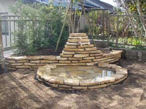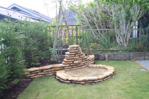 芝でお子様が遊べてシンプルなデザインでとの事でしたが、デッキと芝をメインにし、花壇と立水栓を一体にした水場をポイントにしました。コッツウォルド風の石を積み、水が溜められ遊べる様にしています。芝が芽吹くと更にいい雰囲気になる事でしょう。