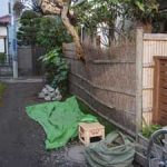 前回は穂垣でしたが、今回は建仁寺垣にしました。既存のザクロを切らなくてもいいように、垣根を細工しています。