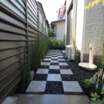 見て楽しむ庭にして欲しいとの依頼でした。垣根の素材にもこだわりモダンな感じにして、大きめのトクサと白御影石を使った市松敷きのアプローチでシンプルに仕上げました。水盤に小鳥が遊びに来ると楽しいですね。大変喜んで頂けました。