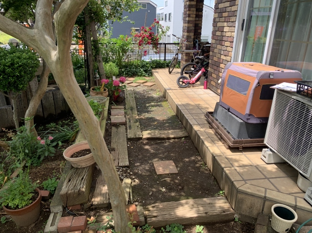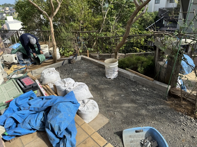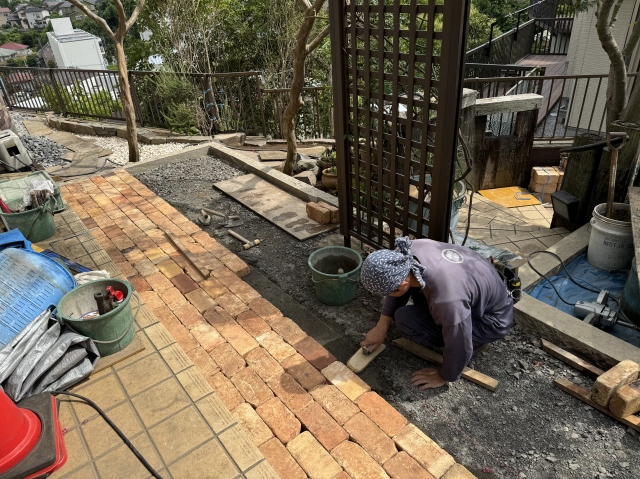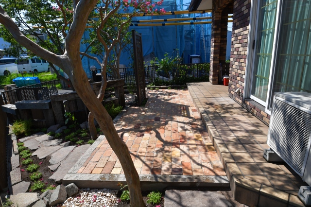 既存の階段はそのまま利用して、ご希望のテラスをメインに、使い勝手が良いように平らな部分の面積を多く設計しました。また小松石を使用した植栽スペース、輸入石材使用により耐久性もあり長年楽しむことが出来ます。アンティークレンガでお子様たちとバーベキューやプールを楽しんでいただけることでしょう。